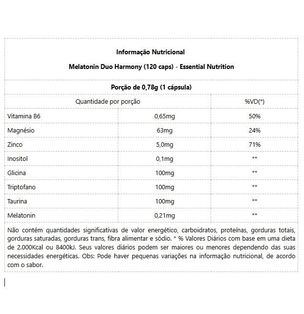 O Melatonin Duo Harmony segue o padrão de excelência da Essential Nutrition, sendo livre de glúten, lactose, corantes e adoçantes artificiais, além de possuir cápsulas de fácil deglutição e alta estabilidade.