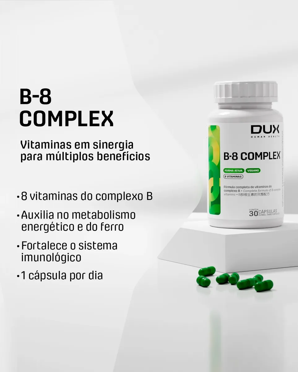 O B-8 Complex Dux Nutrition é um suplemento em cápsulas desenvolvido para auxiliar na produção de energia, manutenção do sistema nervoso e saúde do organismo. Contém uma combinação balanceada de vitaminas B1, B2, B3, B5, B6, B7, B8, B9 e B12, que contribuem para o metabolismo de carboidratos, proteínas e gorduras, além de favorecer disposição e vitalidade diária.
