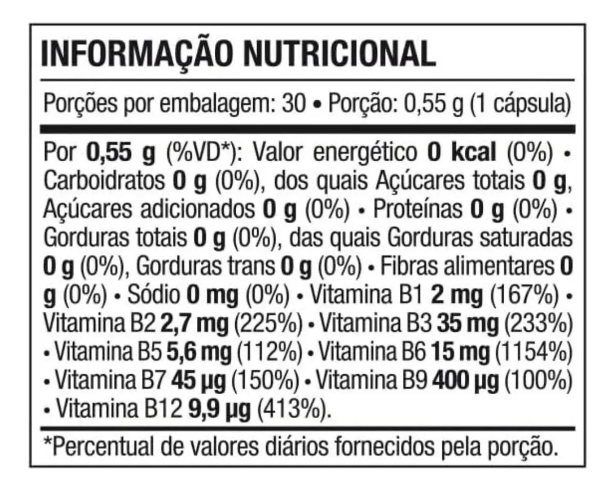 Cada cápsula contém vitaminas do complexo B, incluindo B1, B2, B3, B5, B6, B7 (biotina), B8, B9 (ácido fólico) e B12, em doses que favorecem energia, metabolismo e vitalidade.