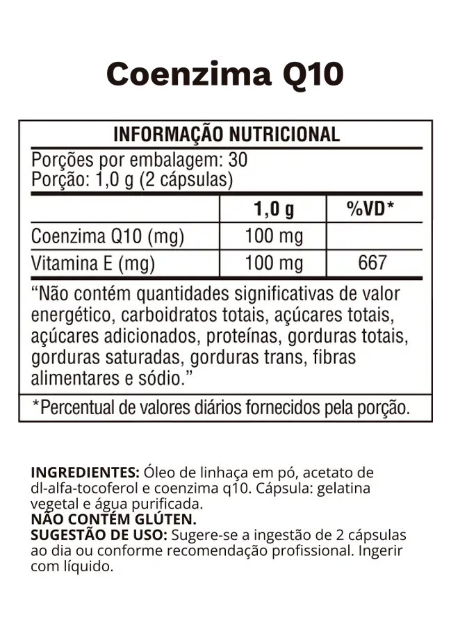 Coenzima Q10 (ubiquinona), óleo de linhaça em pó, vitamina E (acetato de dl-alfa-tocoferol), cápsula vegetal (hidroxipropilmetilcelulose) e antiumectante dióxido de silício.