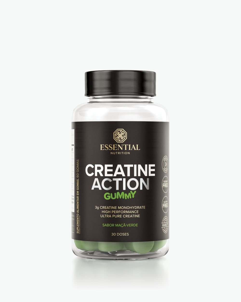 A Creatine Action Gummy Essential Nutrition traz a força da creatina monohidratada em uma forma inovadora, prática e saborosa: gomas mastigáveis com delicioso sabor natural de maça verde. Desenvolvida com tecnologia de microencapsulação e padronização avançada, a fórmula garante alta pureza, estabilidade e absorção otimizada, sem causar desconforto gastrointestinal — um grande diferencial frente aos modelos tradicionais em pó.