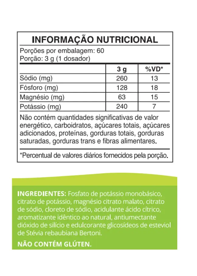 Sódio, potássio, fósforo, magnésio, aromatizante natural de limão.