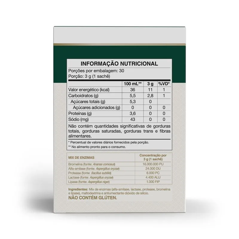 Blend de enzimas digestivas (amilase, protease, lipase, lactase e celulase) associado a prebióticos e probióticos, com 3g por sachê.