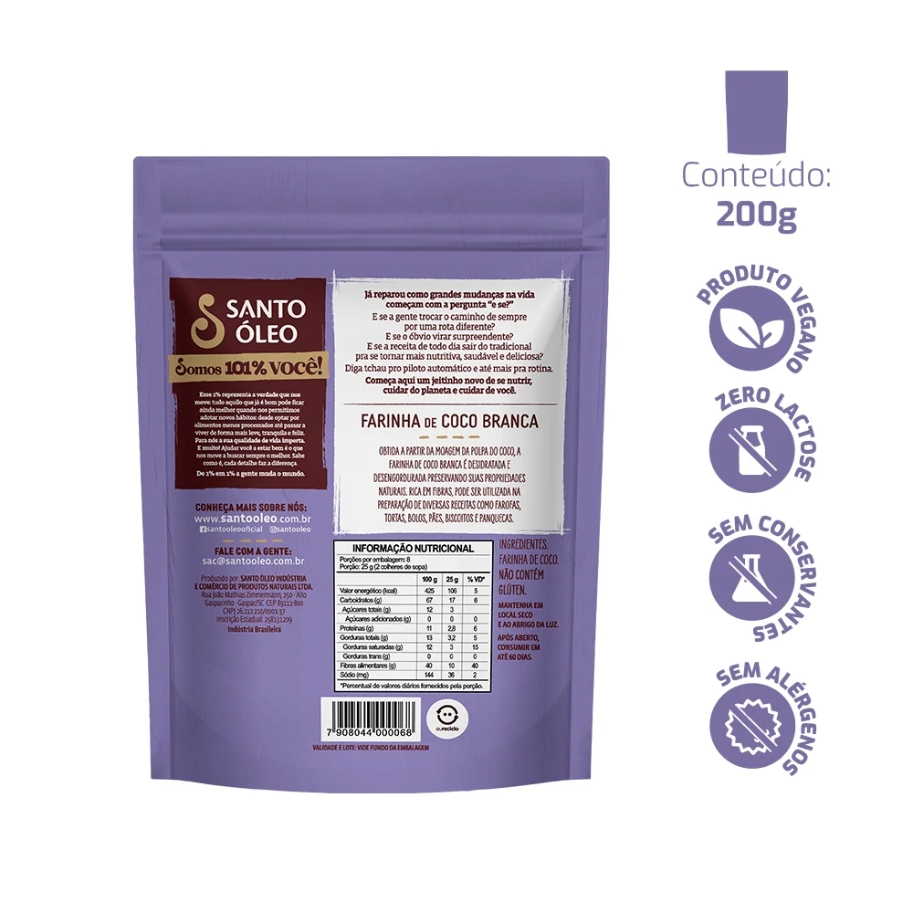 A Farinha de Coco Branca Santo Óleo é um alimento 100% natural e funcional, obtido da polpa fresca do coco por meio de um processo de prensagem a frio e secagem controlada, que preserva seus nutrientes, aroma e sabor suave. Essa tecnologia garante uma farinha leve, rica em fibras e com baixo teor de carboidratos, ideal para quem busca uma alimentação equilibrada, sem abrir mão do sabor e da nutrição.