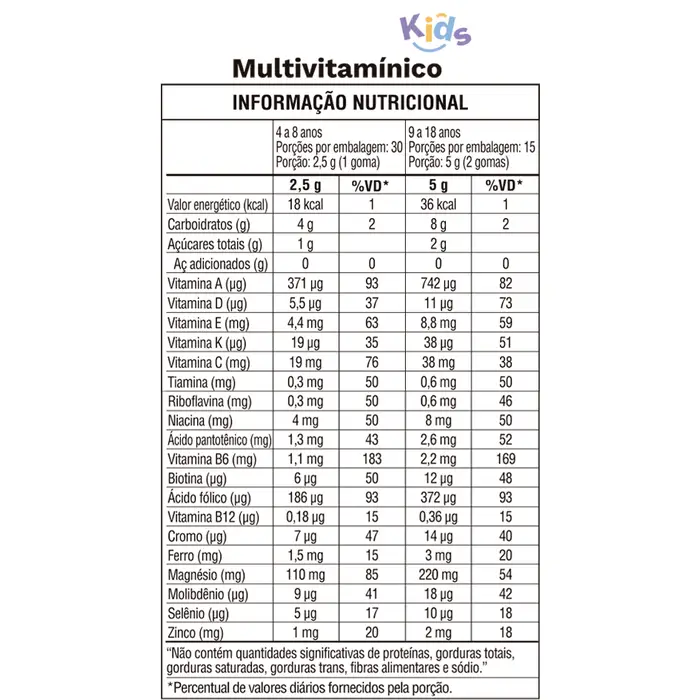 Vitaminas (A, C, D, E, complexo B), minerais (Zinco, Selênio), gelatina vegetal, xarope de glicose, acidulante ácido cítrico, aromas naturais.