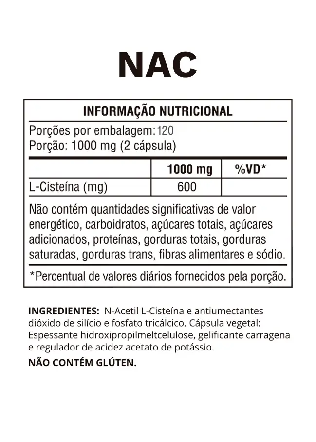 N-Acetilcisteína (NAC), cápsula vegetal e excipientes naturais.