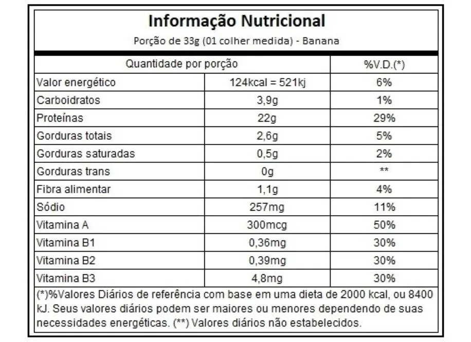 Proteína isolada da ervilha e do arroz integral, banana em pó, canela em pó, aroma natural, estévia e taumatina.