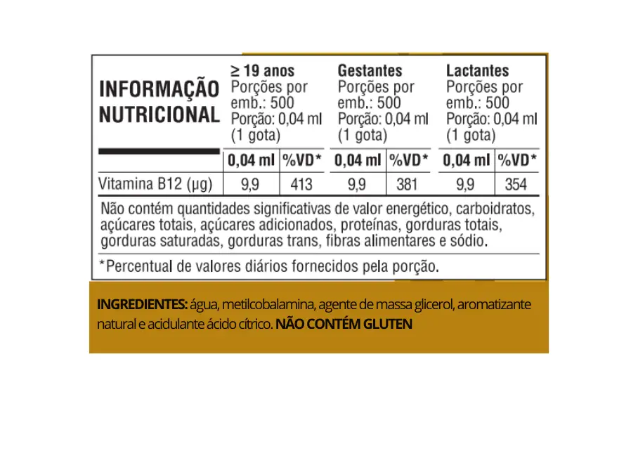 Água purificada, metilcobalamina (vitamina B12), glicerina vegetal, acidulante ácido cítrico e conservante sorbato de potássio.