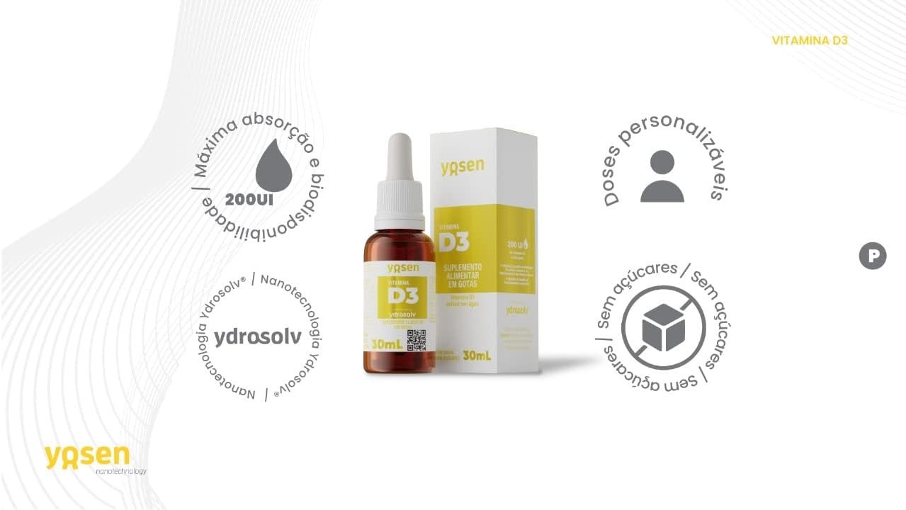 O Vitamina D3 Hydrosolv Yosen é um suplemento líquido desenvolvido com tecnologia Hydrosolv, que proporciona alta absorção e biodisponibilidade superior às cápsulas e comprimidos tradicionais. Sua fórmula líquida permite dosagem prática e personalizada, contribuindo para a saúde óssea, fortalecimento do sistema imunológico e manutenção da vitalidade geral.